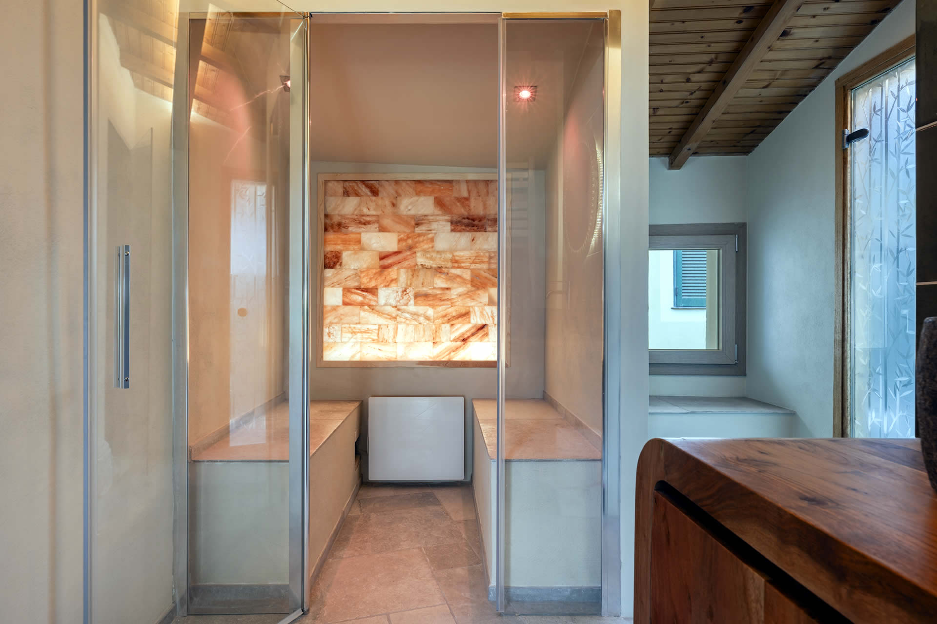 • Stanza del Sale, con pareti rivestite da cristalli naturali che ricreano un microclima marino (haloterapia), benefico per respirazione, difese immunitarie, pelle e rilassamento.