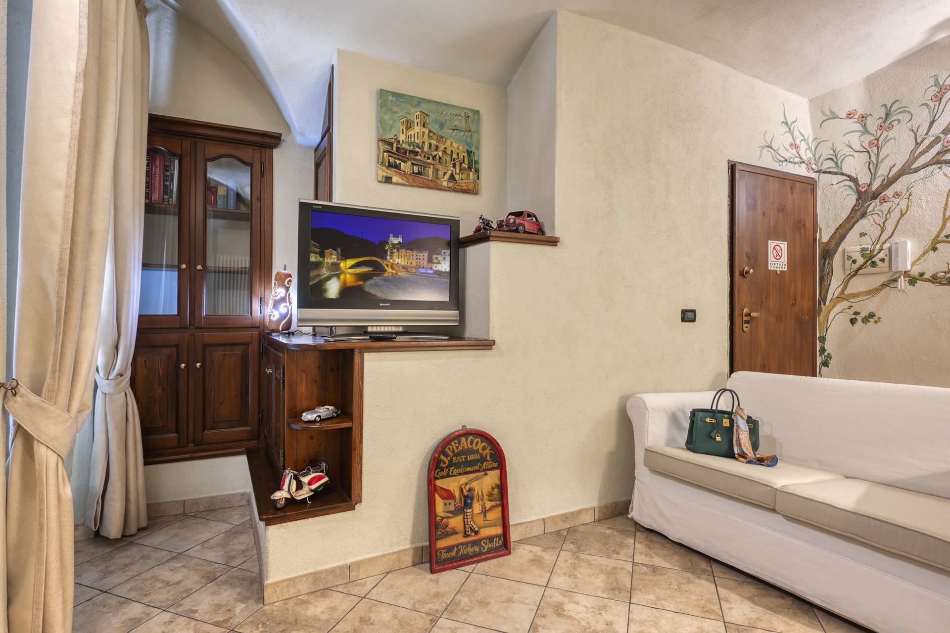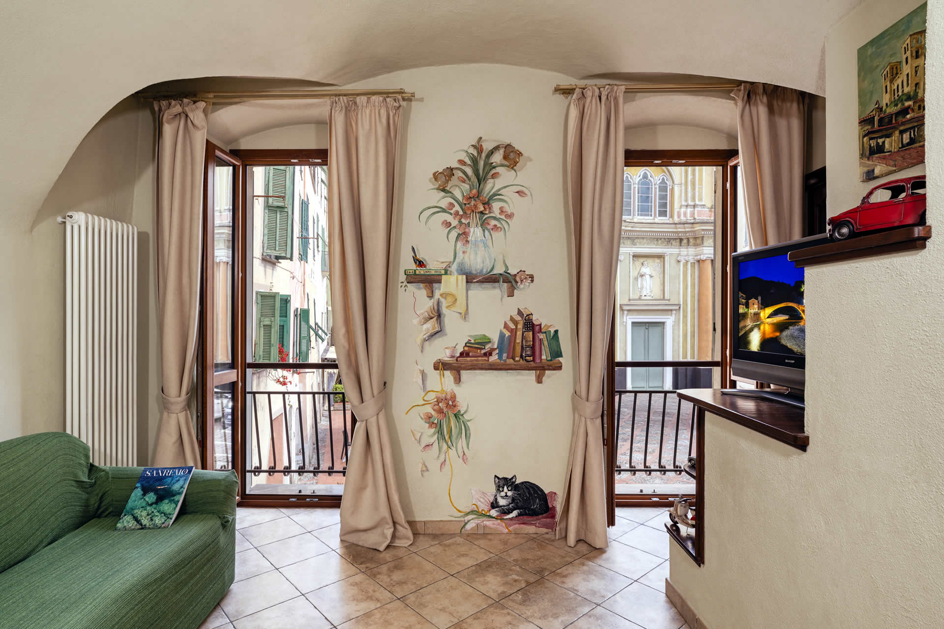 Situato nella piazza principale del borgo medievale di Dolceacqua, proprio di fronte alla chiesa, l'Appartamento Piazza Centrale Rocca offre un soggiorno autentico nel cuore pulsante del paese. Le sue pareti decorate da una nota artista locale donano all'ambiente un carattere unico, dove arte e tradizione si incontrano con eleganza.