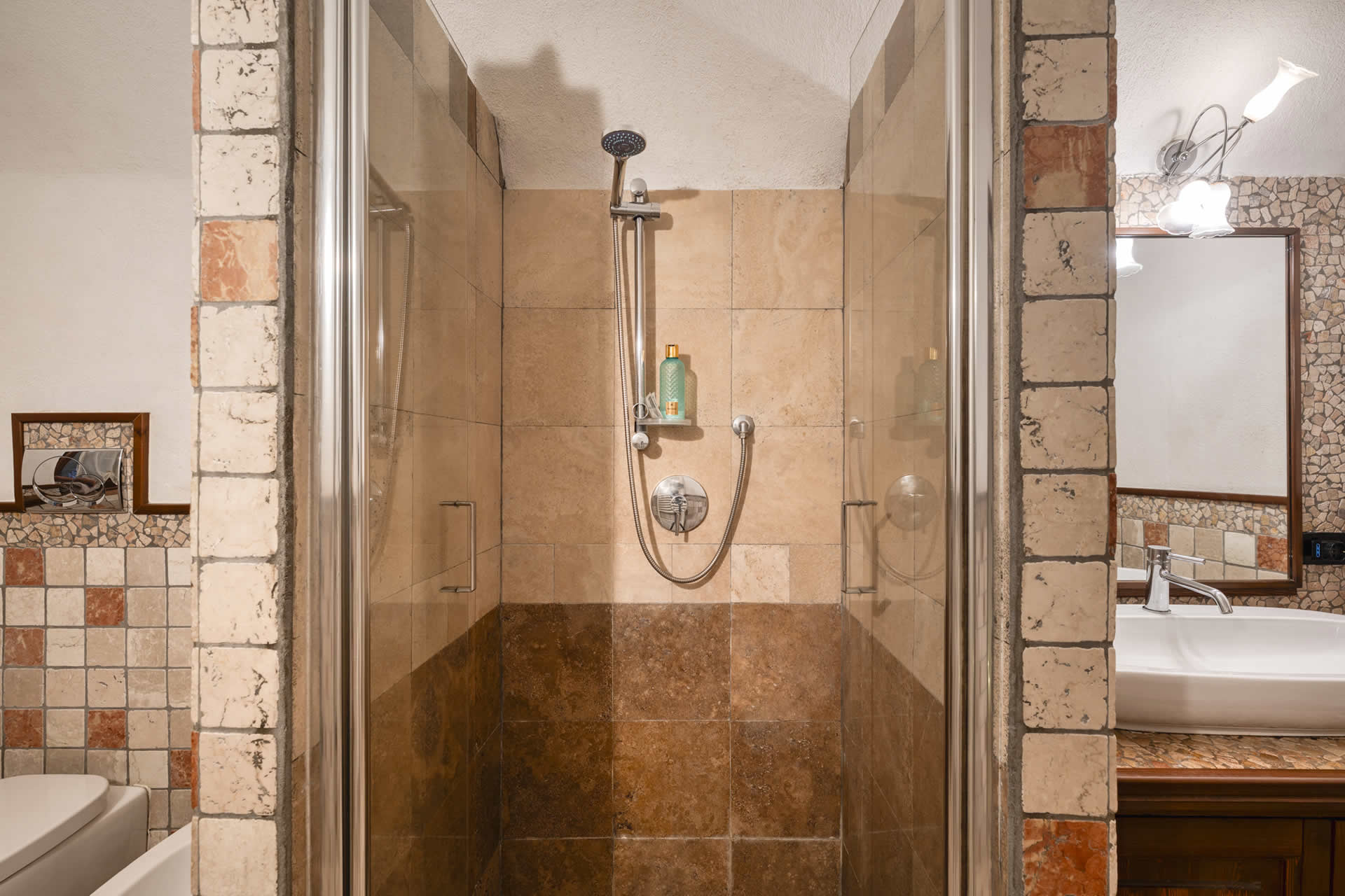 • Bagno moderno con doccia, set di cortesia e biancheria completa per letto e asciugamani.