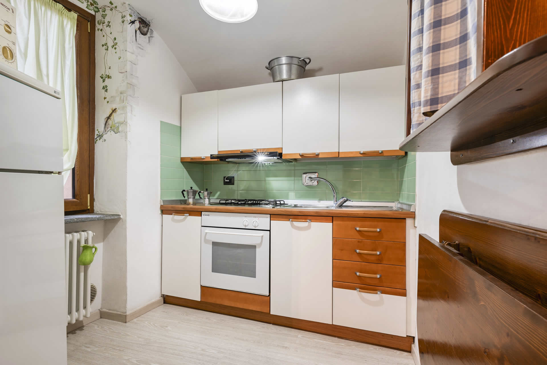 • Ampia cucina attrezzata, completa di elettrodomestici e accessori. frigorifero, forno, piano cottura, spremiagrumi elettrico, bollitore, macchina del caffè espresso con cialde, tè e tisane.